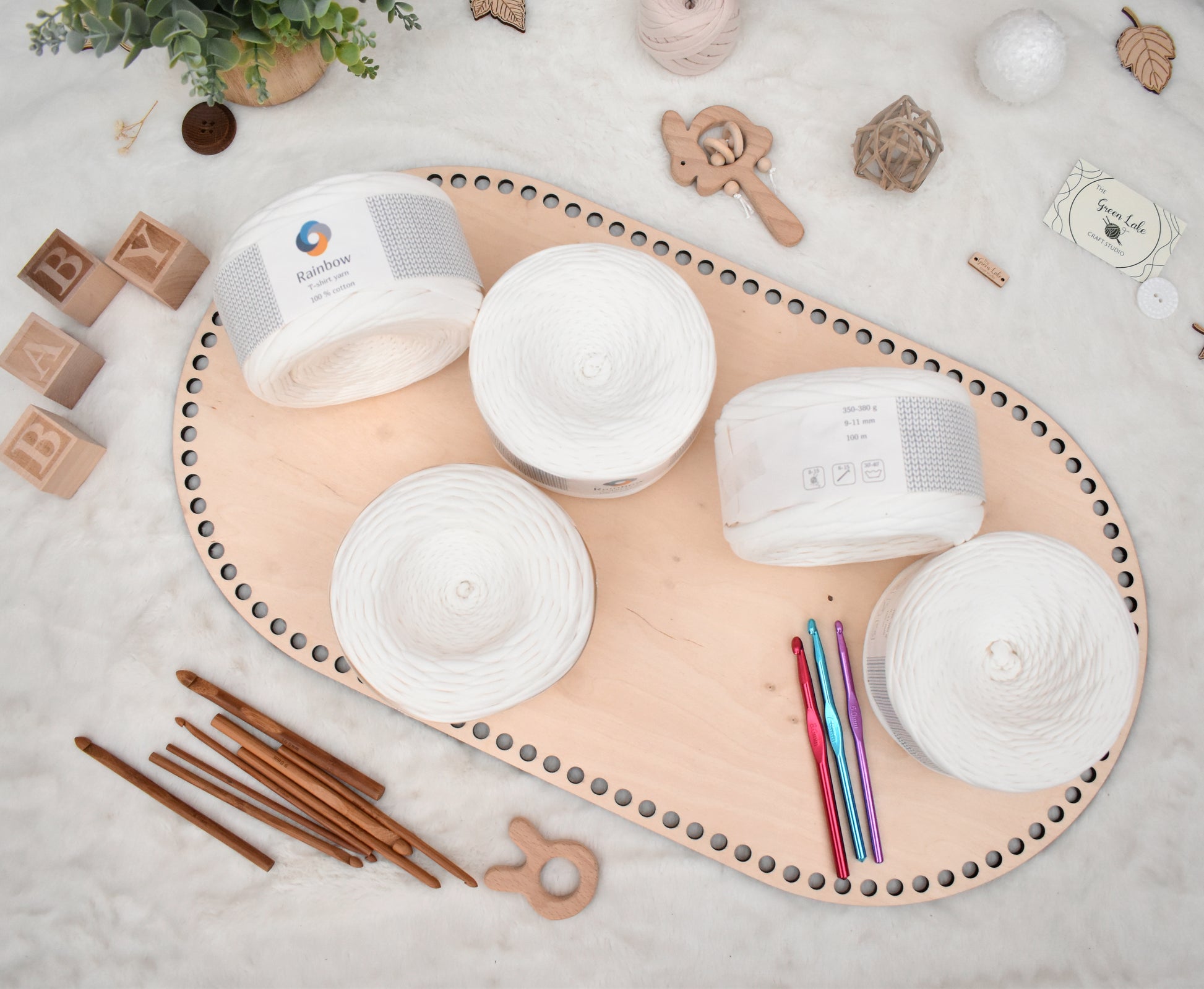 The best yarn to use with the base is either Tshirt yarn 9-11mm thick or cord yarn 9mm thick.