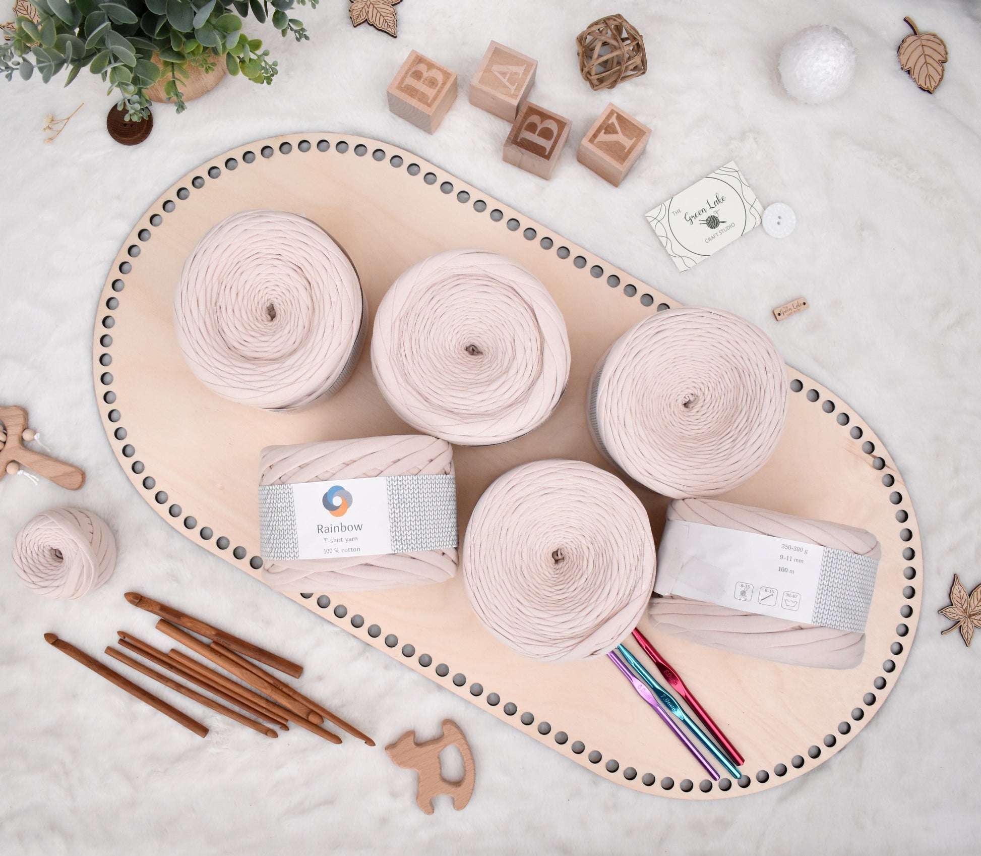 The best yarn to use with the base is either Tshirt yarn 9-11mm thick or cord yarn 9mm thick.