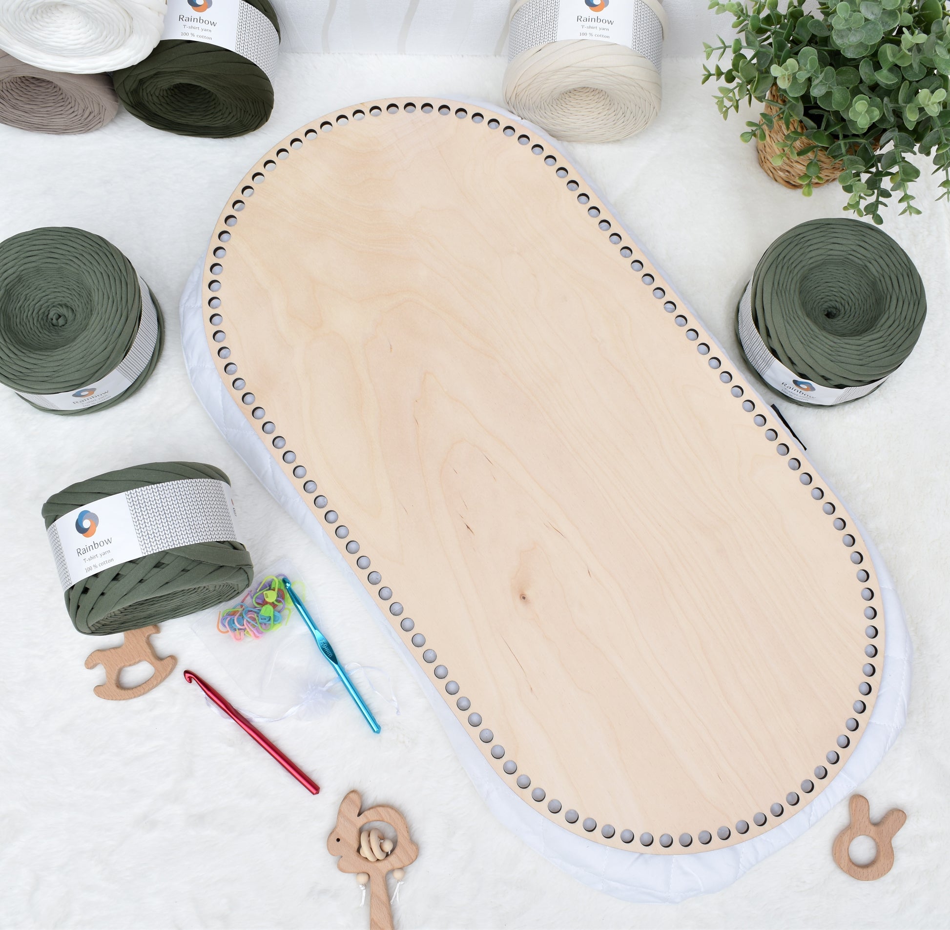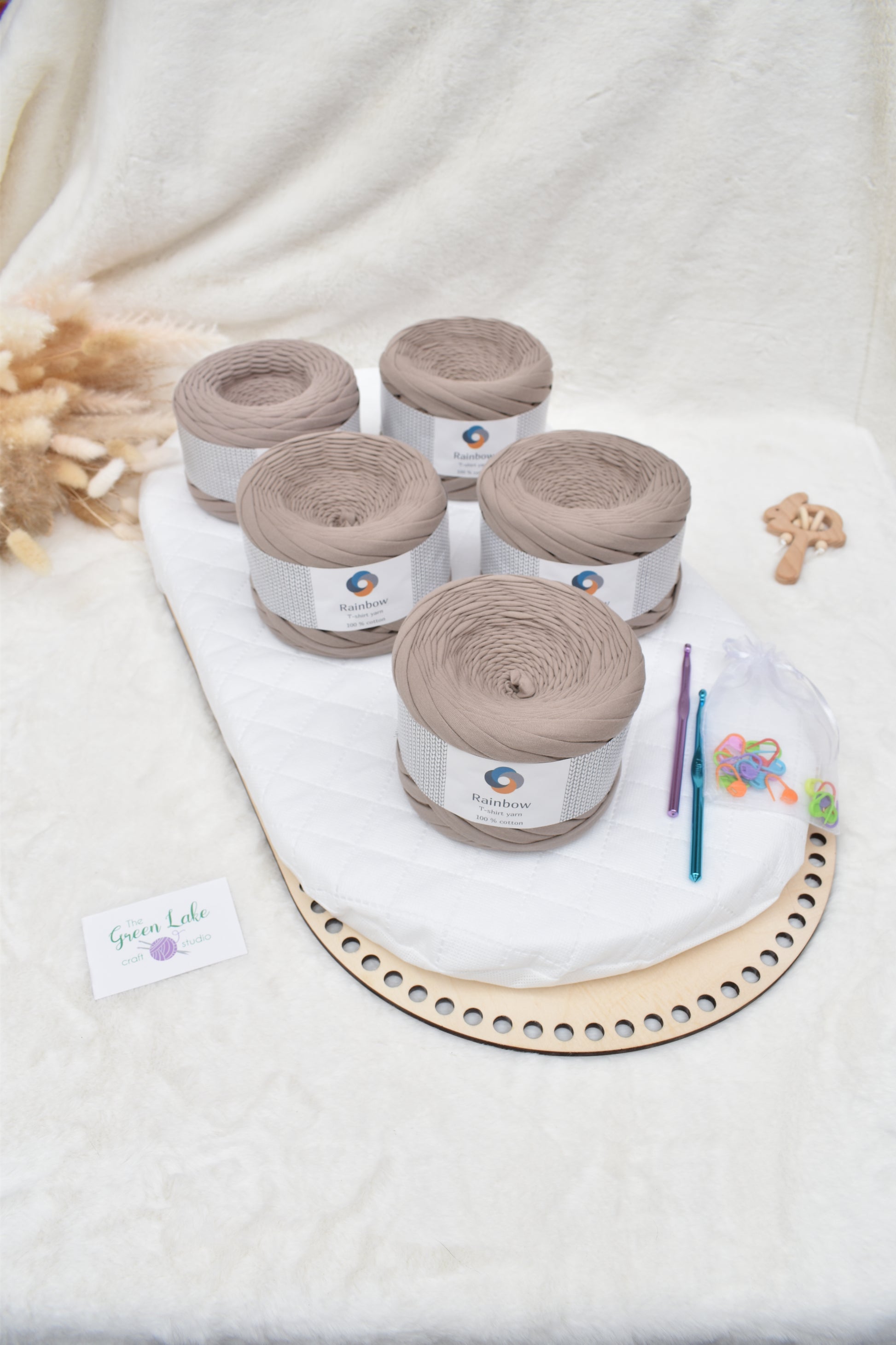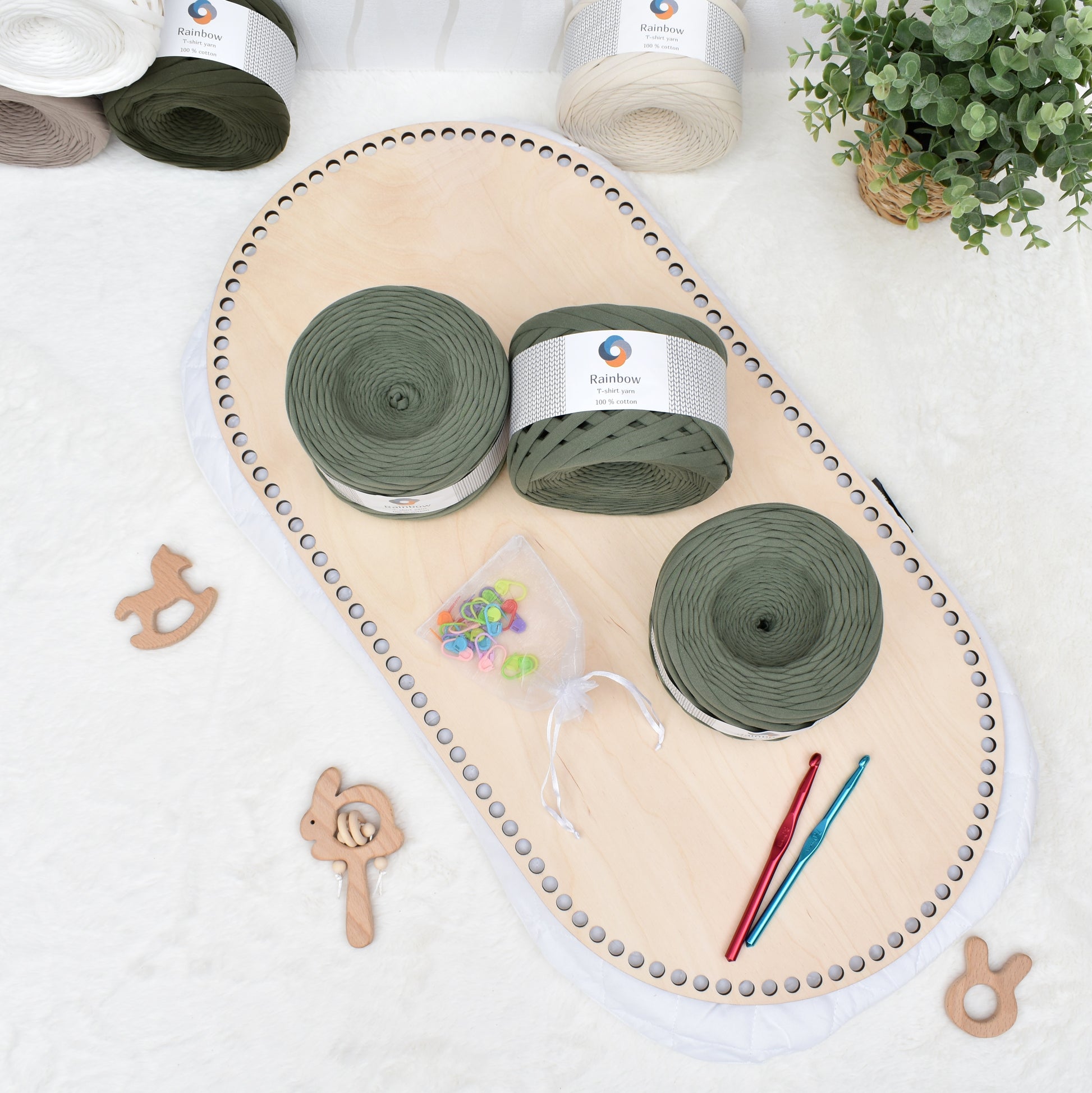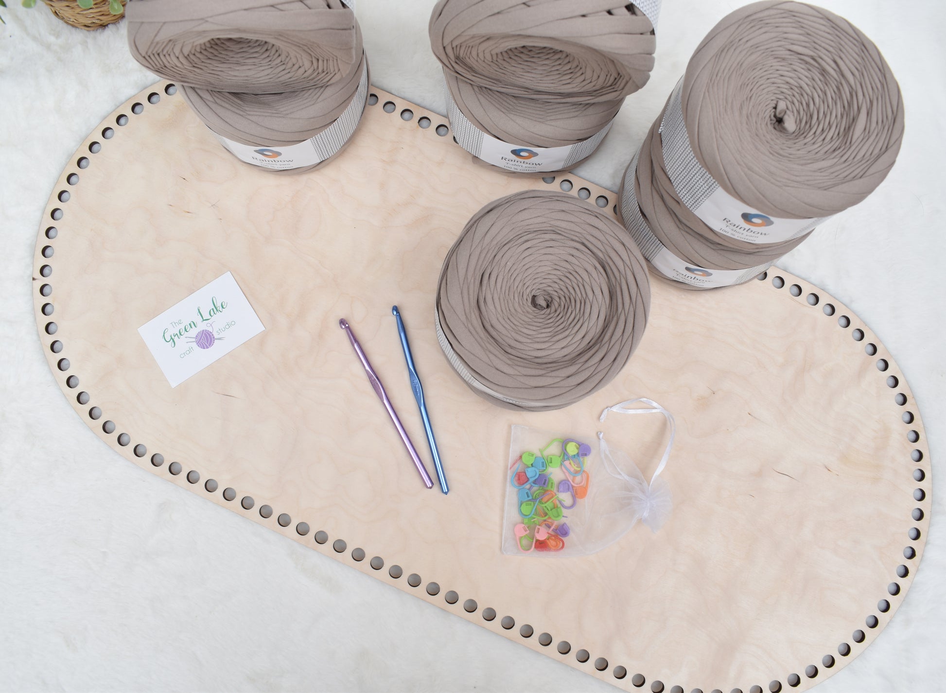 ☆ Tshirt yarn 9-11mm thick x 7 balls (choose the colour from the drop down menu please). 7 balls of tshirt yarn is enough to make a basket with handles without the hood.