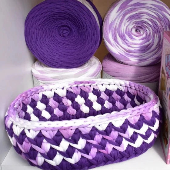 T-shirt yarn is the most popular yarn for crocheting the baskets. However you can macrame cord or even four strands of a 100% cotton yarn (50gr/100m per ball).