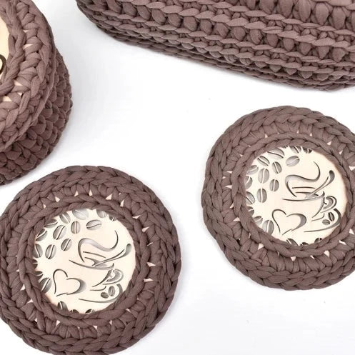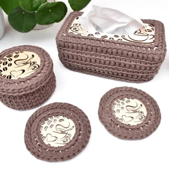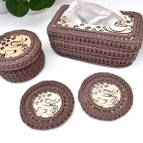 Coffee companion set including a small basket with coffee design lid, large tissue box cover and a pair of matching coasters!